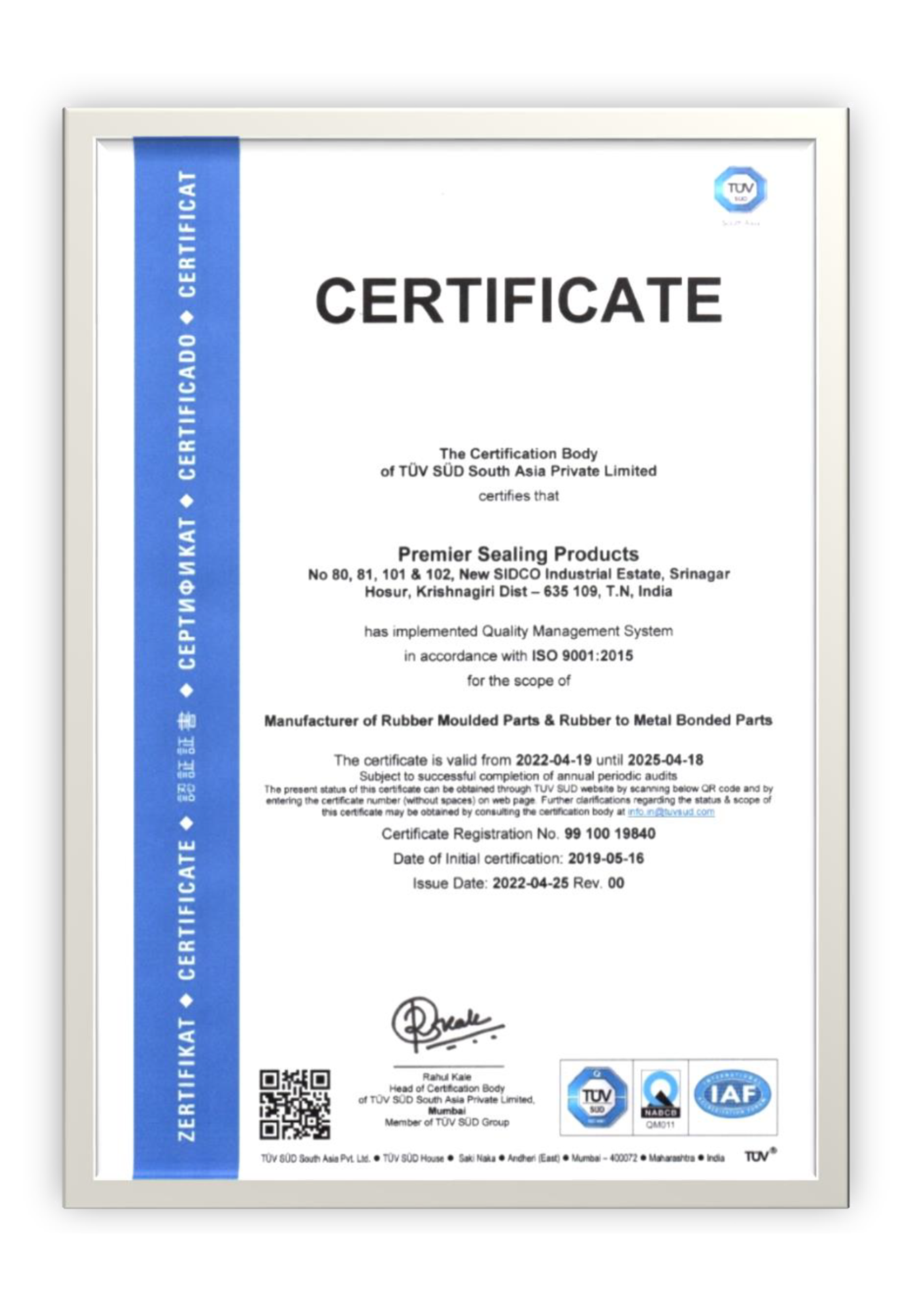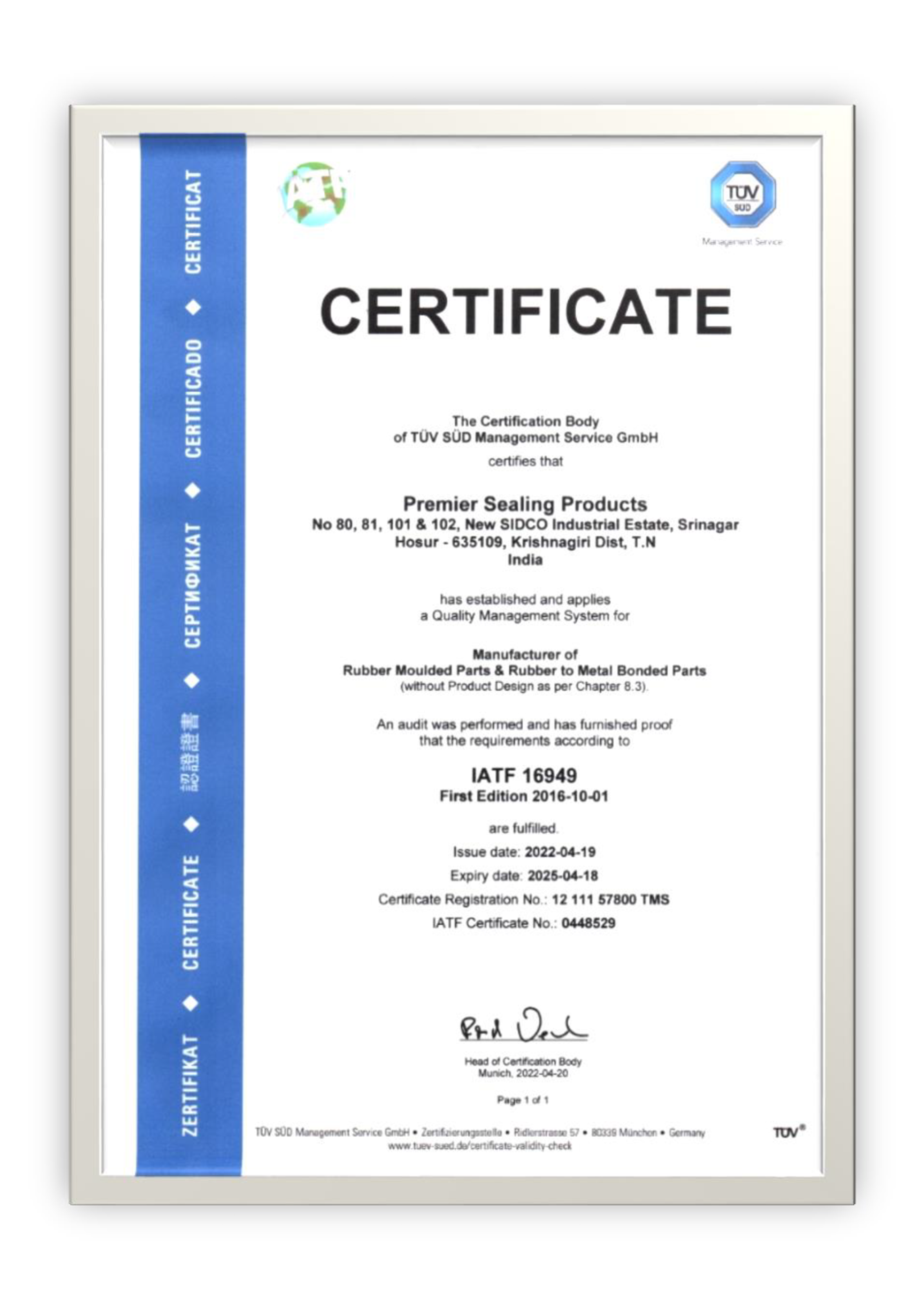 "Premier Sealing Products is proudly certified with ISO 9001 and IATF 16949 by TÜV SÜD, reflecting our commitment to global quality standards and excellence in manufacturing. In addition, we are a registered exporter with a valid Import Export Code (IEC), enabling us to serve customers across 14+ countries with certified, compliant, and timely deliveries."
